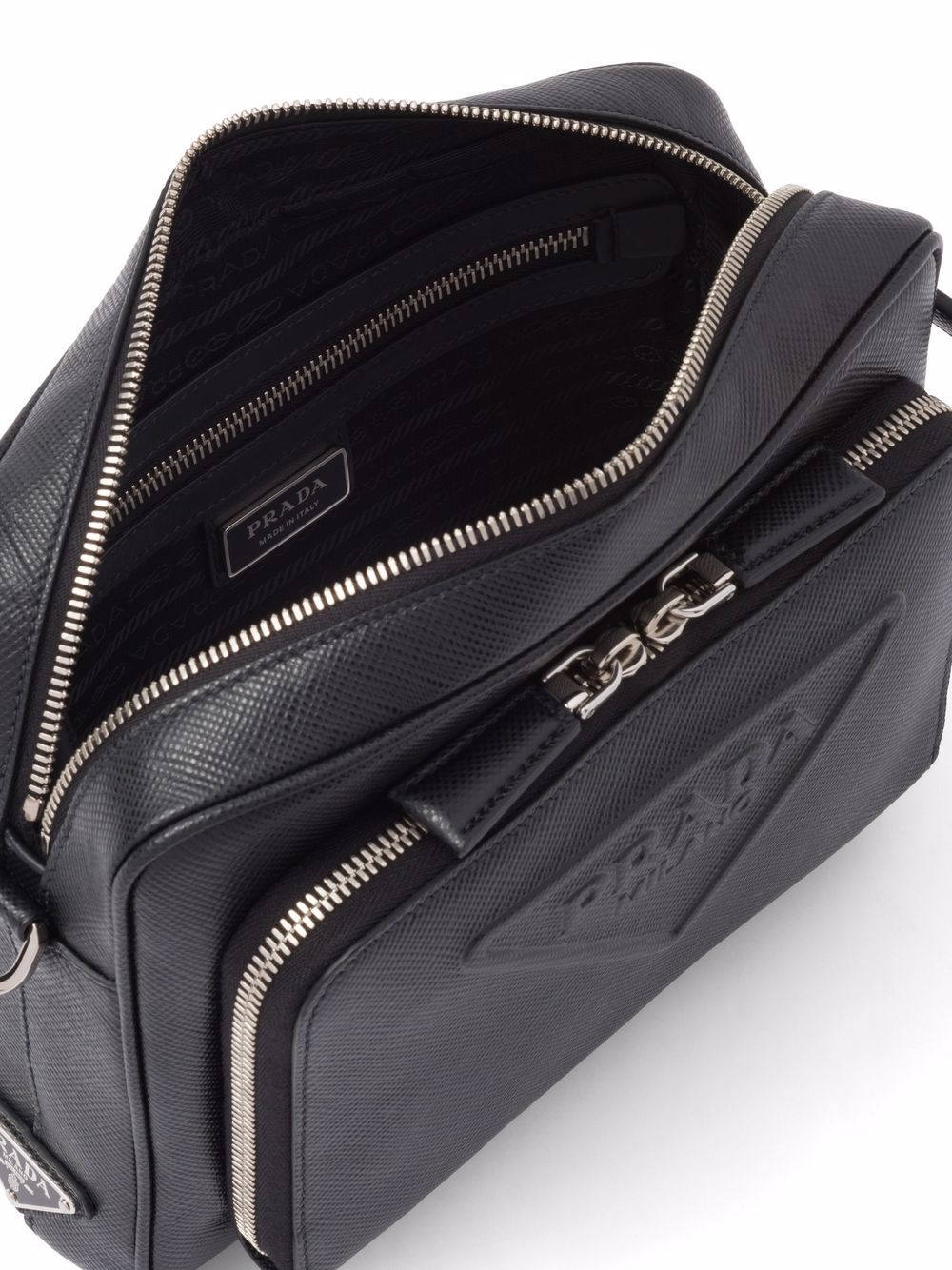 - Crafted from Prada’s signature Saffiano leather, this bag fuses functionality and style. The main compartment is closed by a zip fastening and complemented by a removable zipped pouch that can be attached to the detachable shoulder strap.