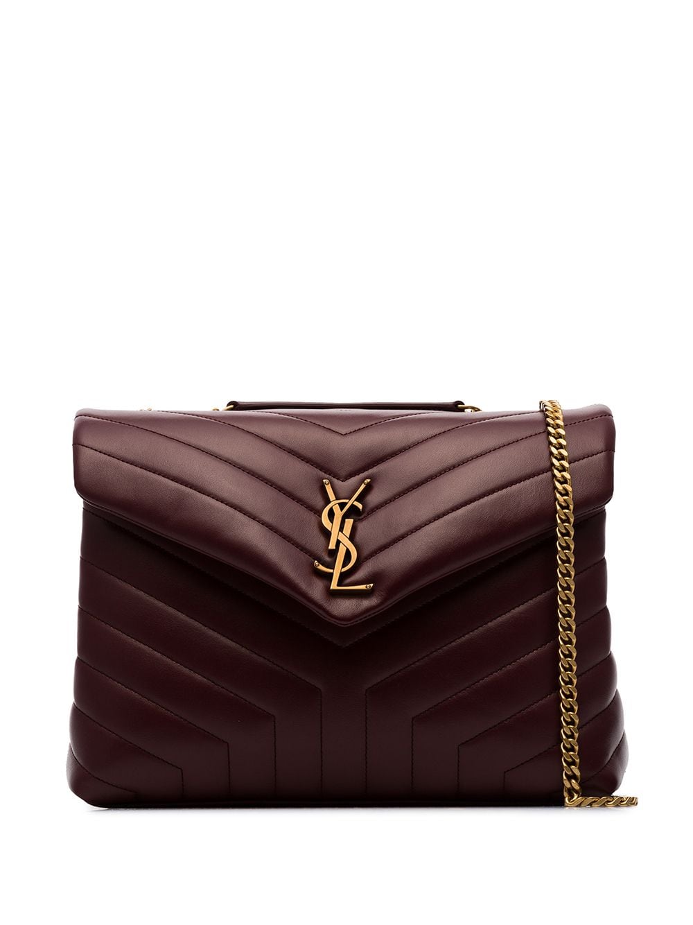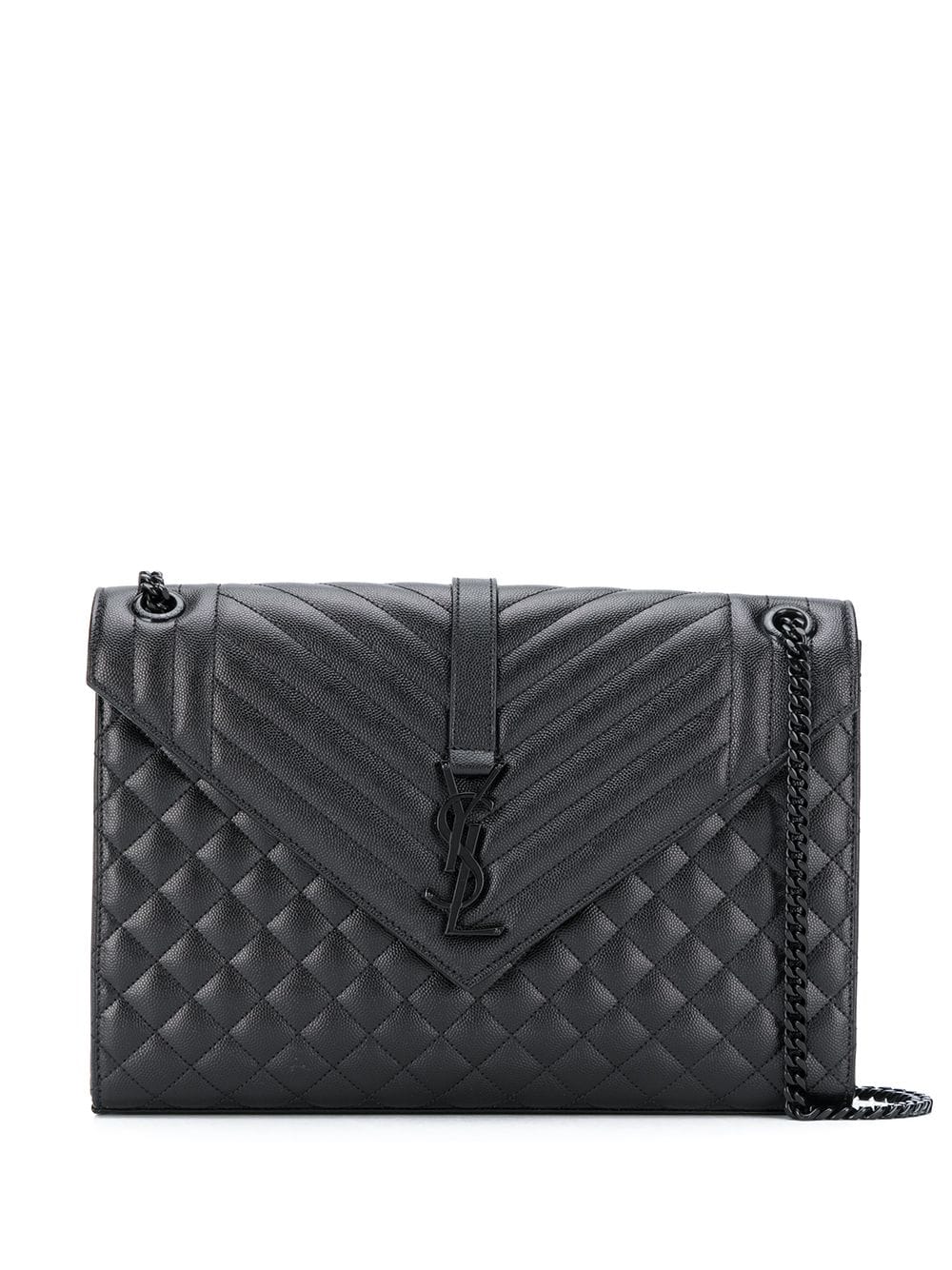 - Saint Laurent’s Loulou Puffer shoulder bag is defined by the chevron-quilted denim construction, which accentuates the softened silhouette. Italian crafted, it has the iconic YSL logo plaque at the magnetic envelope flap that opens to a lined interior and a stamped logo patch.