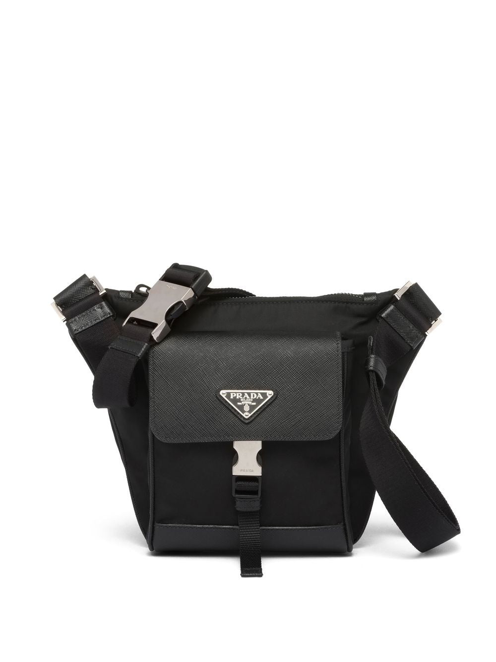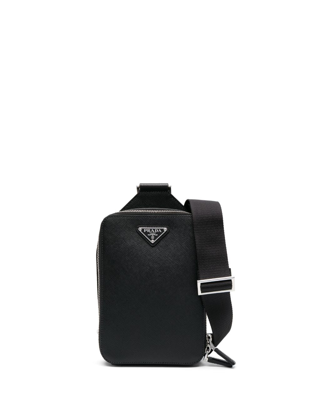 - No more filling those pockets. This black Saffiano leather logo clutch bag from Prada makes a sleek choice for carrying your essentials. Bulky pockets don’t suit you. Featuring a wrist strap, a top zip fastening, six card slots, an internal slip pocket, a front logo plaque and silver-tone hardware.