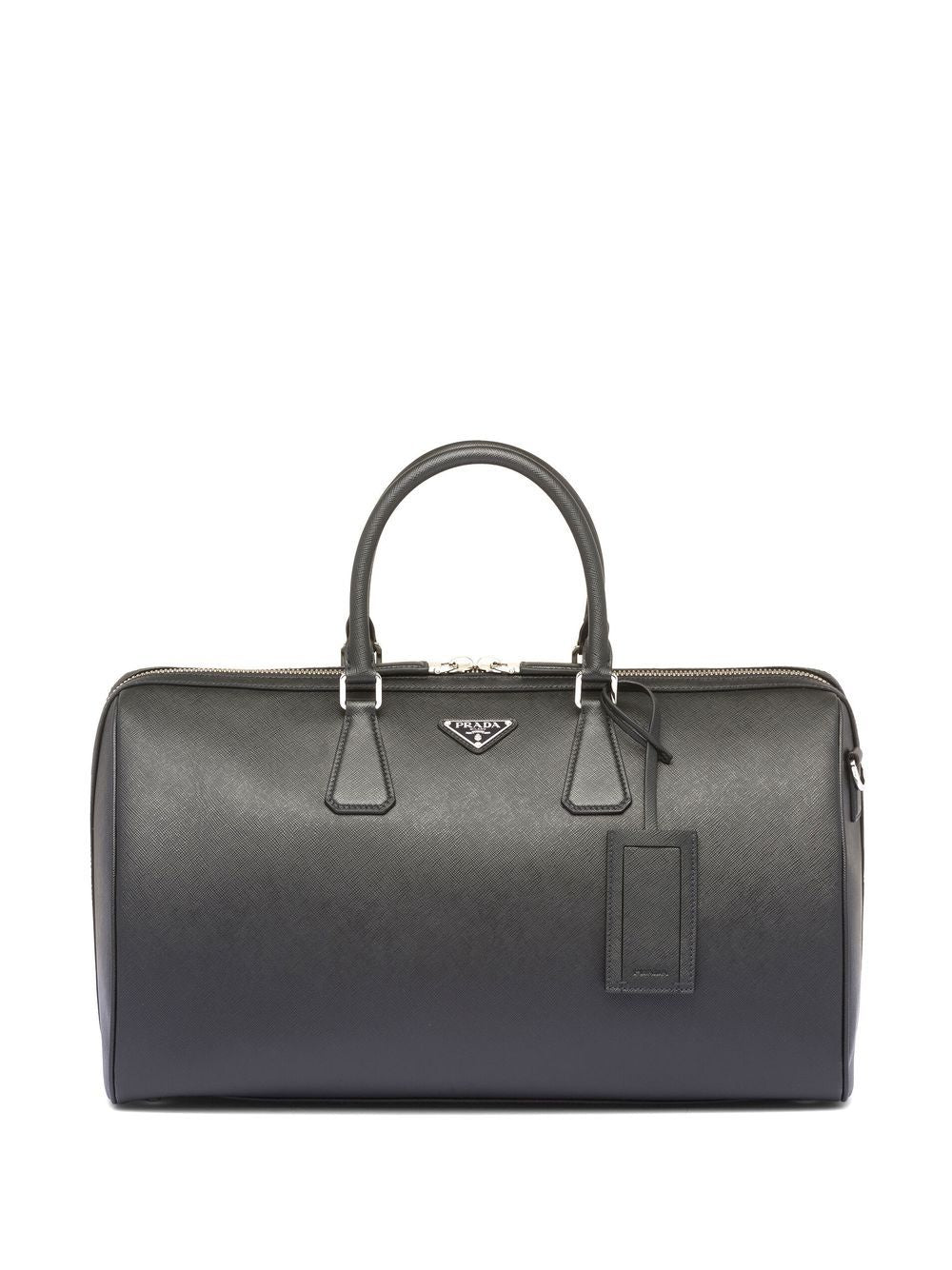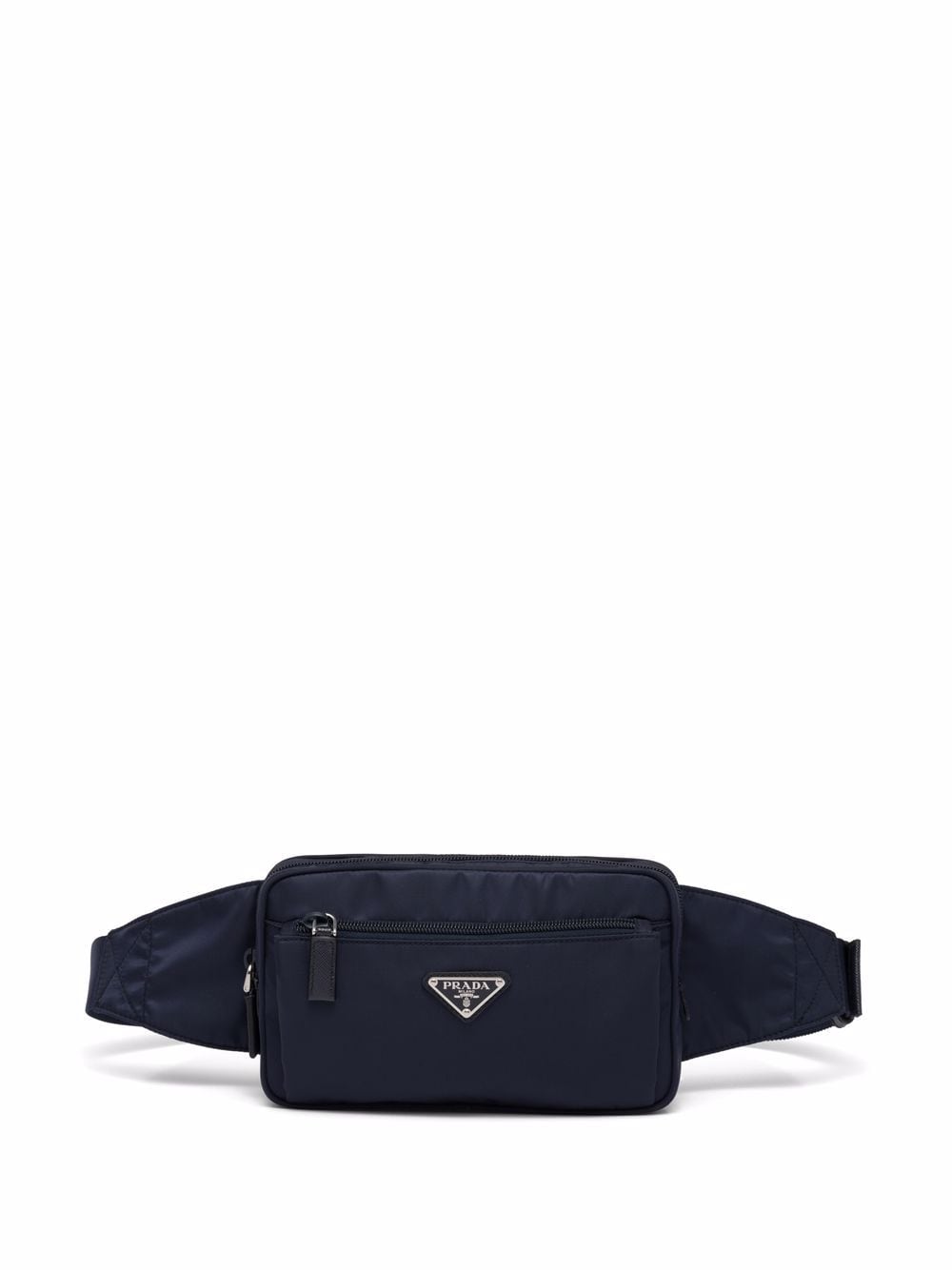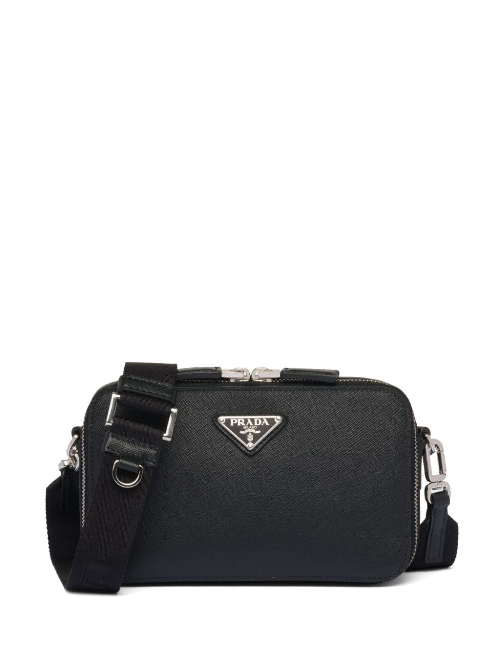 - There’s no such thing as too many black bags. This logo-plaque shoulder bag from Prada raises the game with a handy pouch at its crossbody strap. Room for a little one?