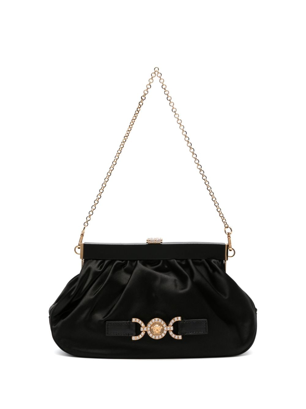 Greca Goddess mini bag from Versace featuring signature Greca detailing, foldover top with magnetic fastening, internal card slots, chain-link shoulder strap, dark purple and calf leather.