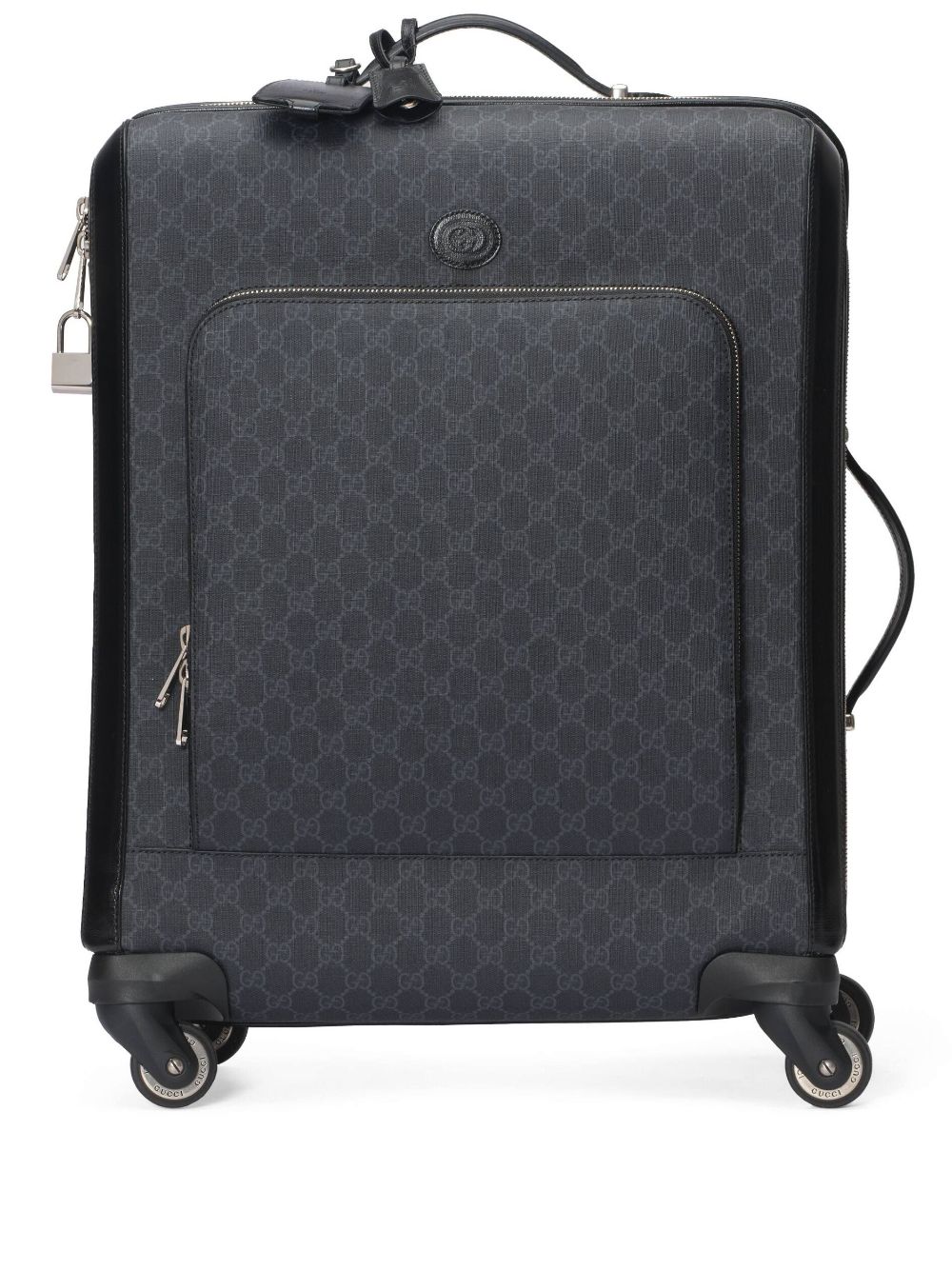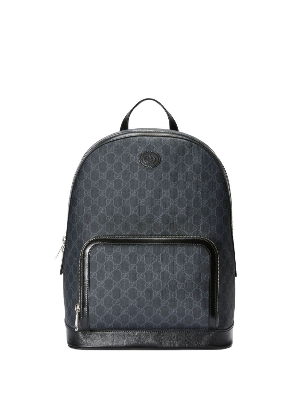 - Ideal for the discerning man about town, this grey and black GG Supreme laptop bag from Gucci is sure to impress. Whether for a business trip, client meeting or work event, this bag is designed with luxury in mind. Featuring leather trim, round top handles, a top zip fastening, an internal zip pocket and signature blue and red striped Web detachable and adjustable shoulder strap.